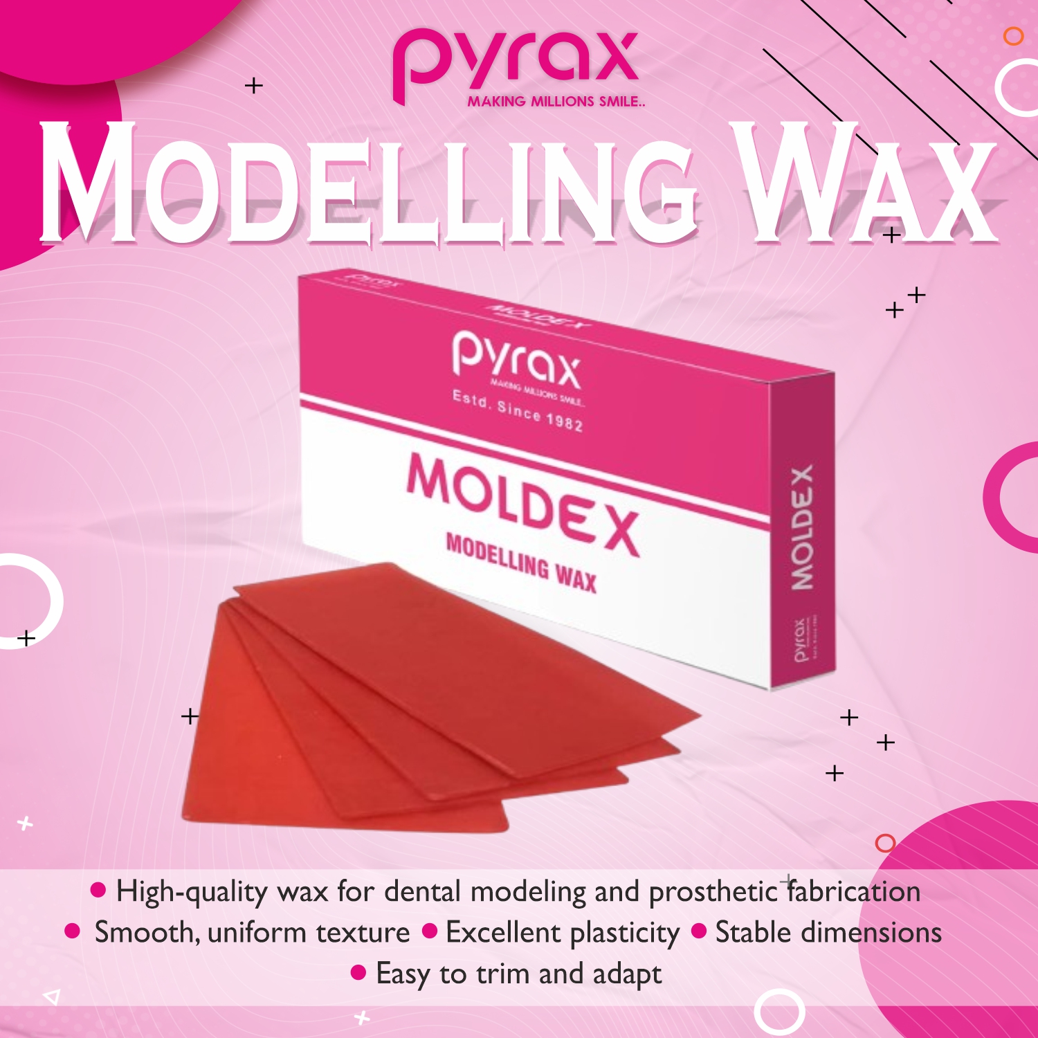 Modelling Wax for Prosthetics is a high-quality dental wax specially formulated for contouring, shaping, and designing prosthetic frameworks. It ensures smooth carving, dimensional stability, and precise adaptation for denture setups and laboratory work