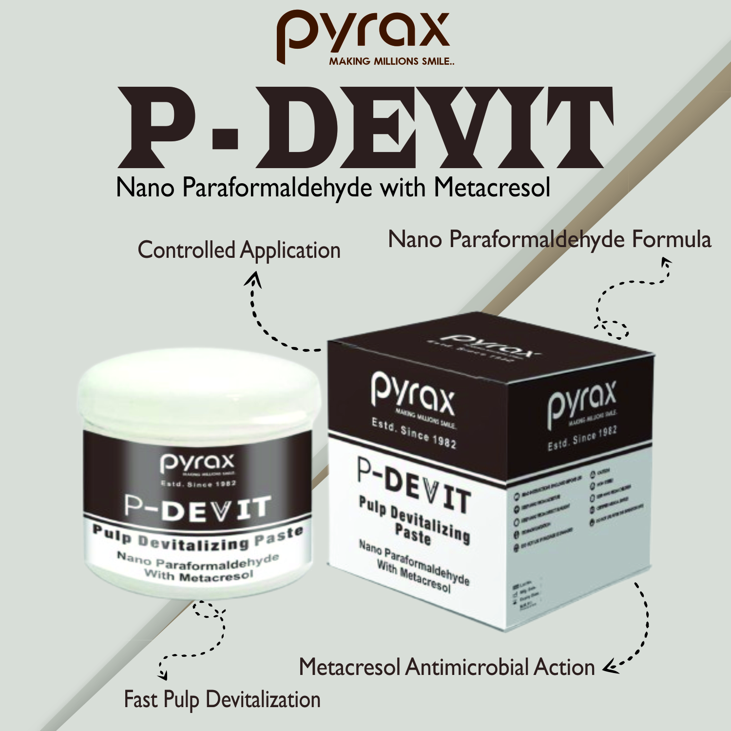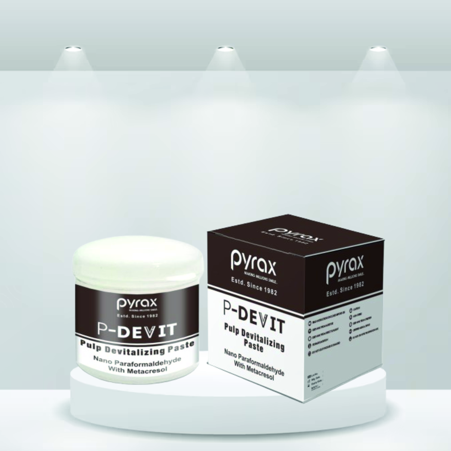 PYRAX, Effectively devitalize pulp with Nano Paraformaldehyde Pulp Devitalizing Paste, designed for safe, fast, and painless treatment of inflamed or infected pulp tissue. Its advanced nano-formulation ensures deep penetration into dentinal tubules, providing reliable devitalization and reducing post-operative discomfort. Ideal for root canal therapy, this paste offers long-lasting action, precise application, and professional-grade safety for consistent clinical results.