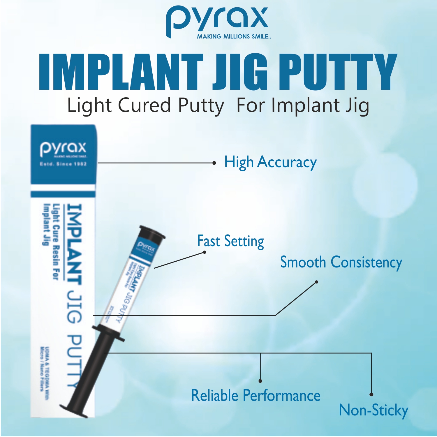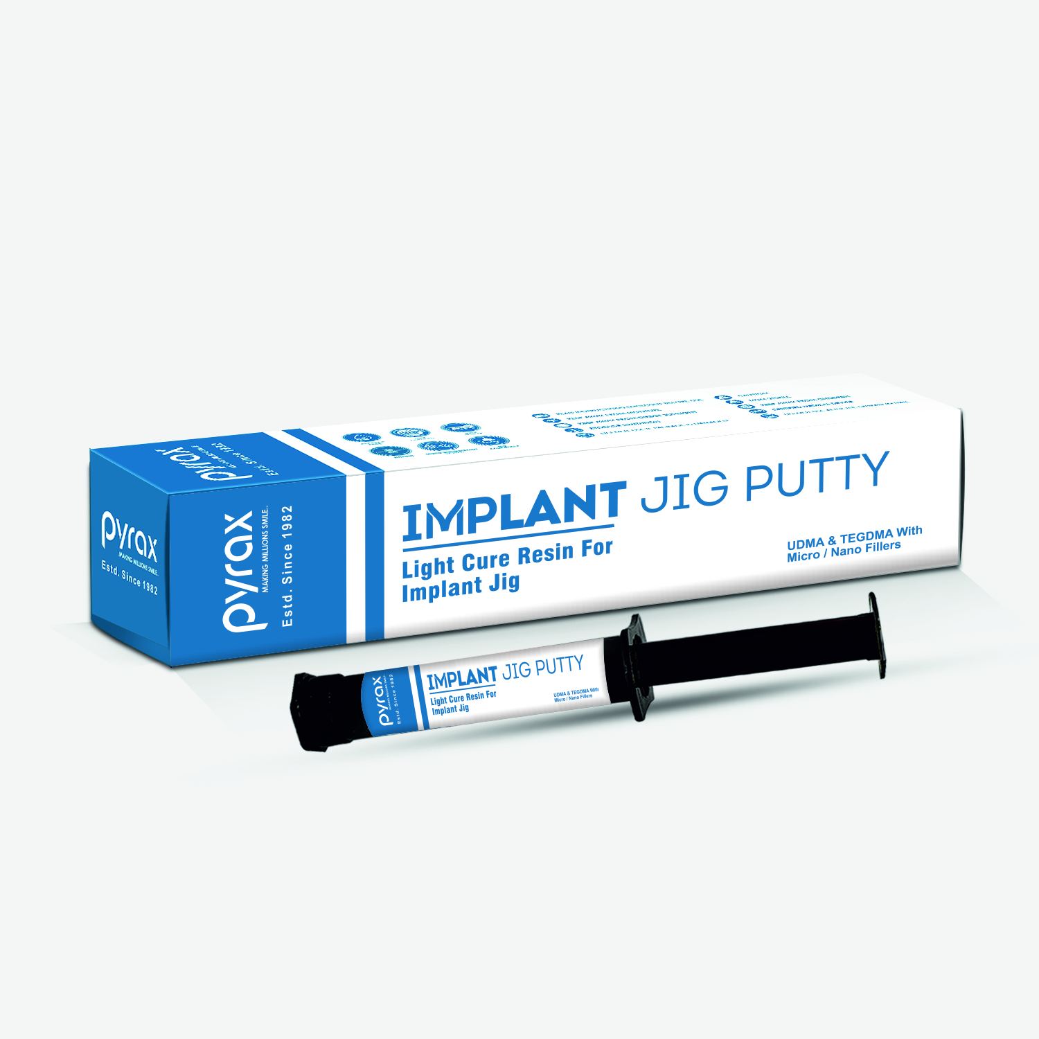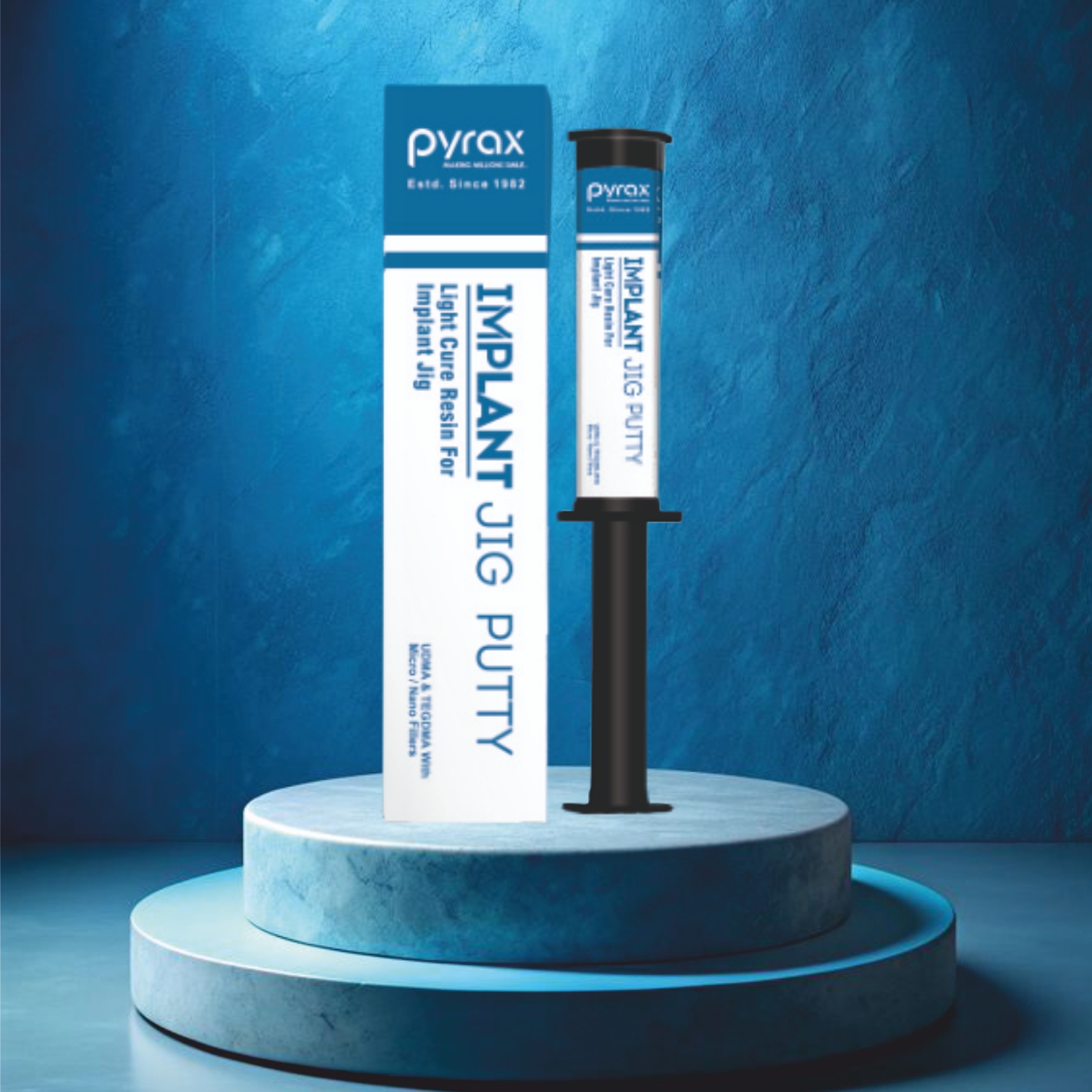 Pyrax The Light-Cured Resin for Implant Jig is a precision-engineered, light-curing putty resin specially designed for accurate and stable implant jig fabrication. Its unique formulation ensures minimal polymerization shrinkage, excellent sculptability, and dimensional stability, allowing dental professionals to achieve perfect implant positioning and accurate impression transfers.