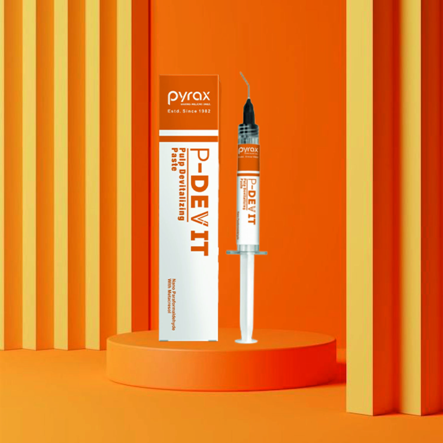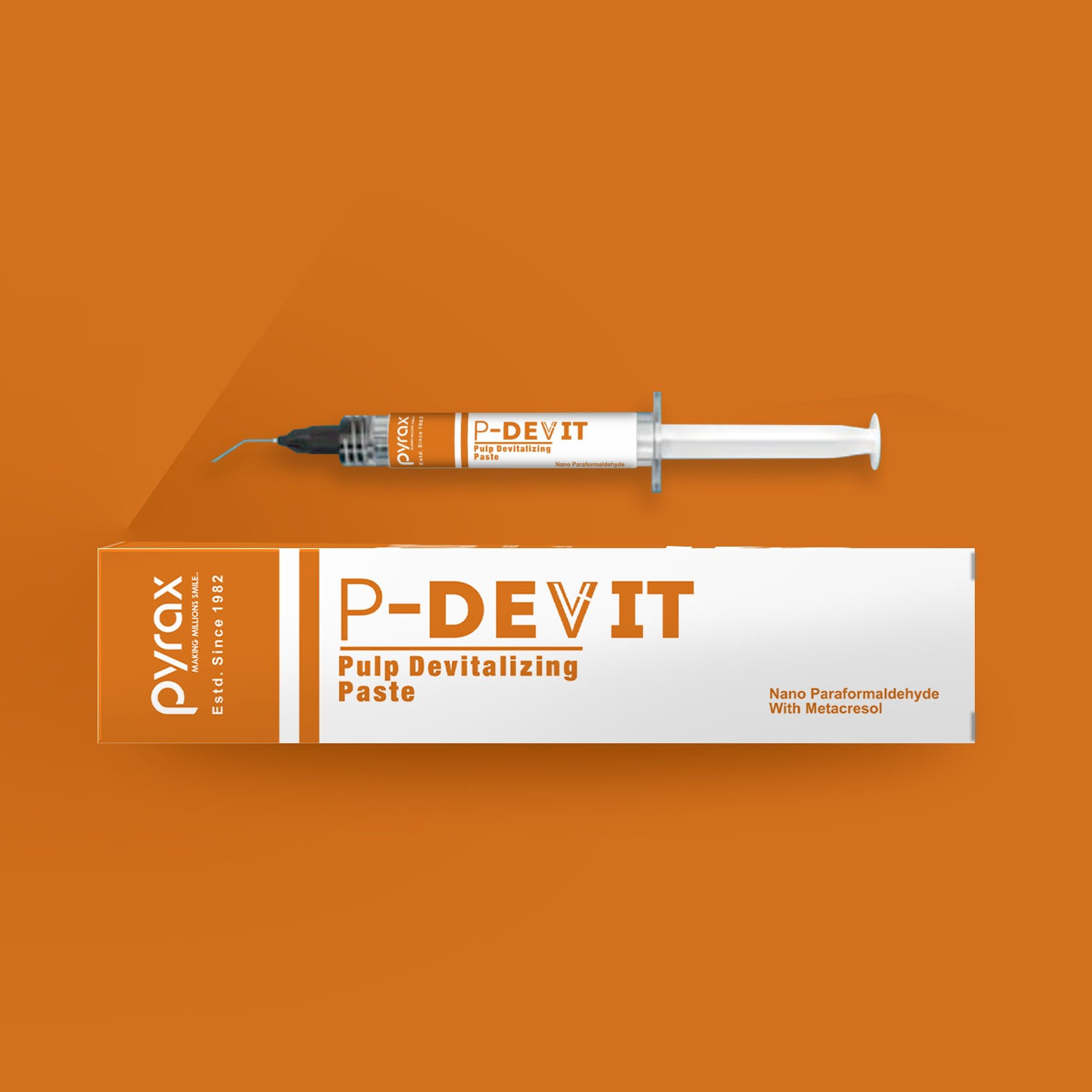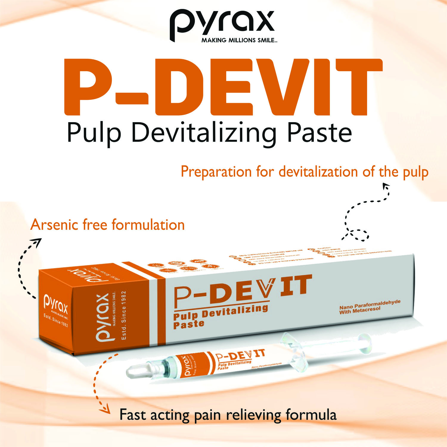 P-devit is a preparation for devitalization of the pulp. P-devit provides powerful pulp devitalizing properties due to paraformaldehyde. It is a fast acting pain relieving paste and easy to apply.